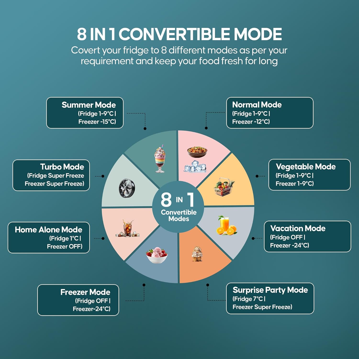About this item Frost Free Refrigerator: Premium auto defrost with powerful cooling and long lasting freshness and performance. Manage your flexible storage needs with convertible 8 in1 technology of this double door fridge: Normal Mode | Veg Mode | Vacation Mode | Surprise Party Mode | Summer Mode | Turbo Mode | Home Alone Mode | Freezer Mode. Capacity: 237 Litres Double Door Refrigerator; This fridge is suitable for families with 3 to 4 members | Freezer capacity: 66 Ltr, Fresh food capacity: 171 Ltr. Energy Rating: 3 Star Double Door Fridge - Energy Efficiency | Annual Energy Consumption: 236