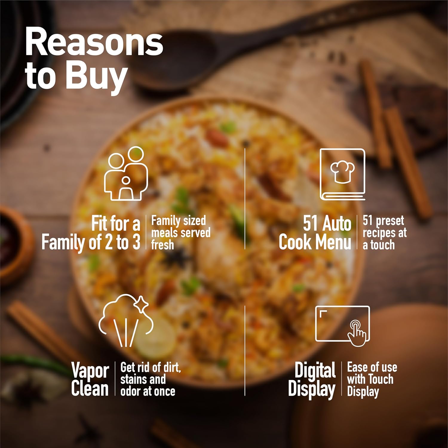 About this item 20L capacity: Suitable for bachelors & small families; power + innovation 800 watts of high power for fast, Even cooking and delicious results Re-Heat & Defrost: Auto programmed reheat and defrost modes ensure even heating or defrosting of food without compromising on the textures of flavour. Auto Cook 51 Menu: Choose from 51 preset recipes ranging from snacks to desserts to make every day meal a gourmet delight. Vapor Clean: Keep oven odor free and stain free with the touch of a button