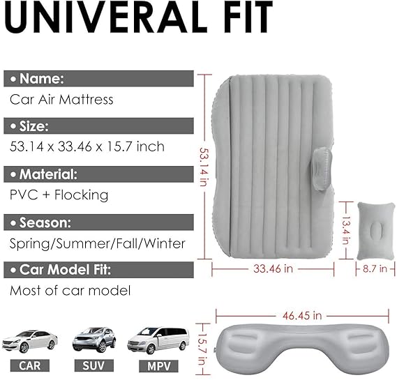 About this item Quality Flocking Car Air Mattress: Made of PVC, Very Soft, Comfortable and Durable, Most Importantly, It Is Non-Toxic, Tasteless, Anti-Seismic and Pressure Proof. Easy to Carry and Use: The Back Seat Car Inflatable Mattress Fits the Car Perfectly, As Soon As You Connect the Electric Pump to the Car Lighter Socket, It Will Complete a Quick and Easy Inflation in Two Minute