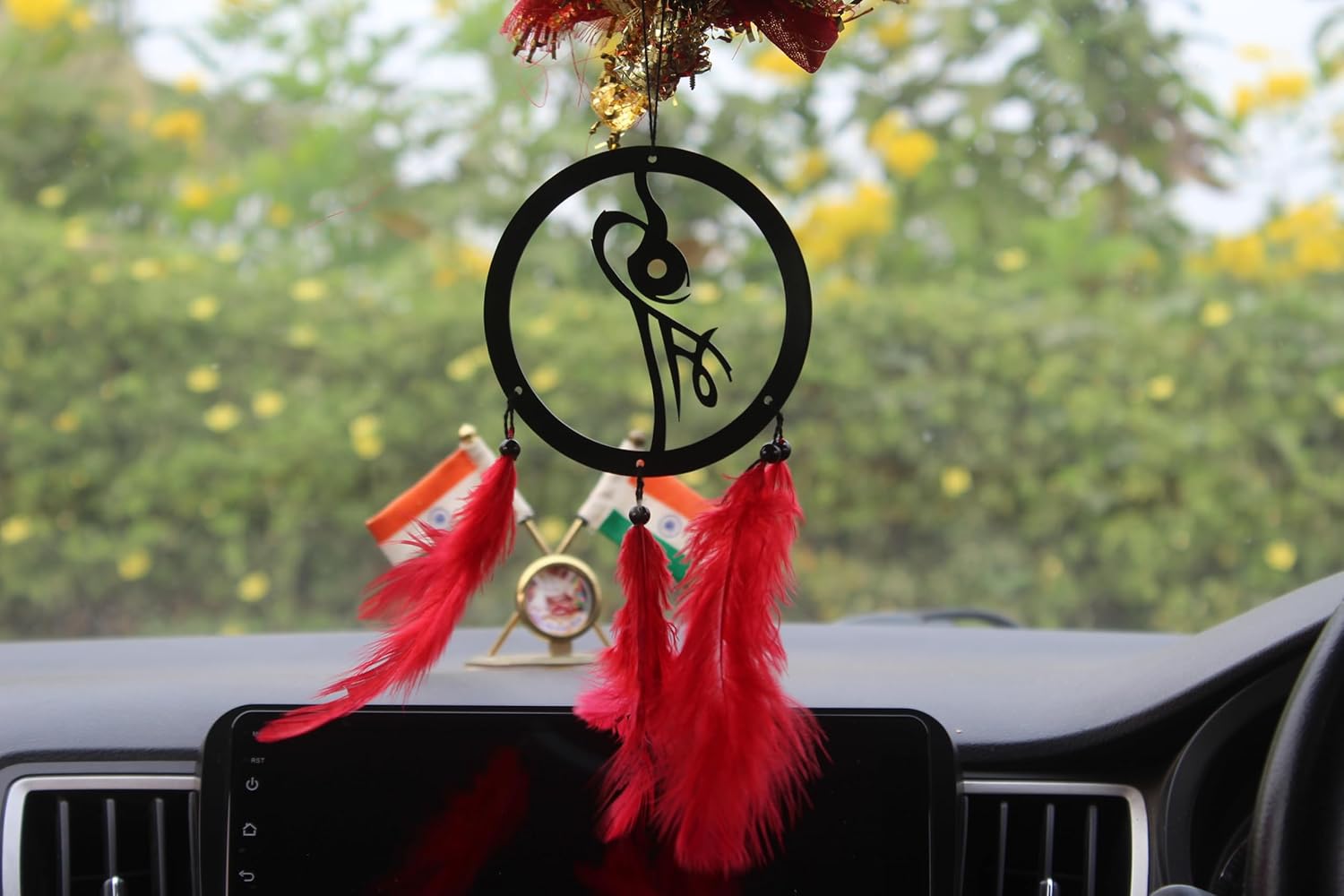 About this item TRADITIONAL DESIGN: Elegant round car hanging ornament featuring a spiritual motif with decorative red feathers, perfect for adding a traditional Indian touch to your vehicle interior PREMIUM MATERIALS: Crafted with durable black frame and vibrant red feathers, measuring 20 cm in height and 8 cm in width for an eye-catching display VERSATILE MOUNTING: Easy-to-hang design allows quick installation as a dashboard ornament or rear-view mirror decoration, adding style to any car interior