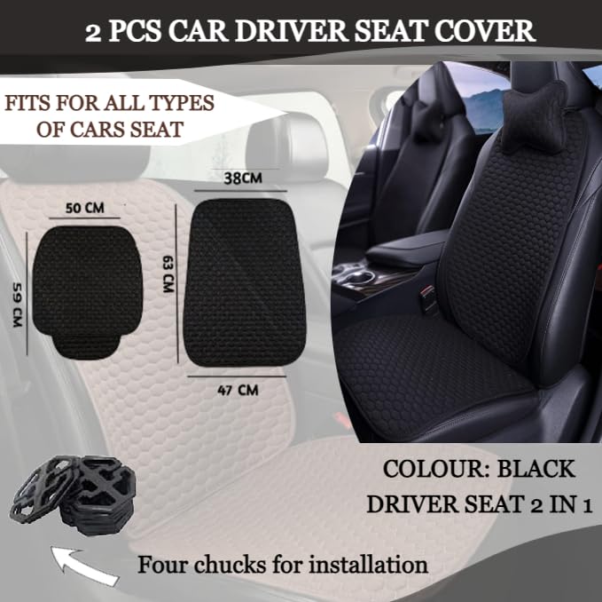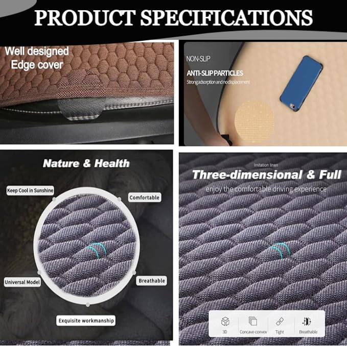 Car Seat Cover Protector mat - Material ; Breathable linen fabrics, Size front seat cover - 50 * 49 cm, Back rest seat cover ; 45 * 63 cm, The Raw fiber material extracted from flax is more flexible and smooth to the touch, which is much better quality and comfort than ordinary cotton and man-made fibers; Color: Black; Type: 3d design Car seat cover. Seat cover for cars -A breathable car seat cover cloth Absorbs and removes odor from the air Radiation protection. Simple and stylish hexogen pattern, perfectly matched with your car interior. The anti-slip rubber effectively fixes the car seat pad.