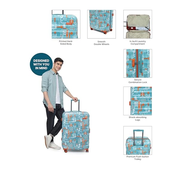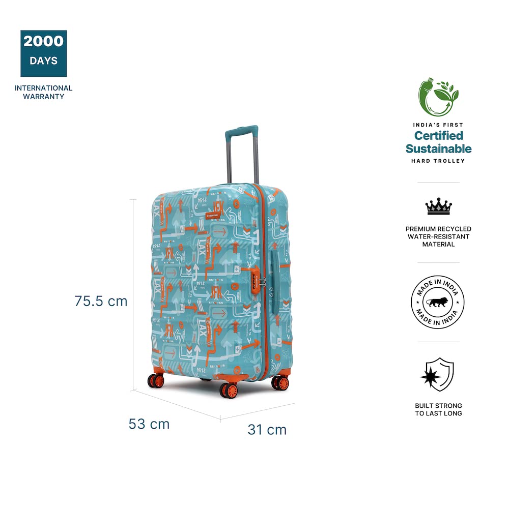 2000 DAYS OF INTERNATIONAL WARRANTY- India's pioneering uppercase JFK Sustainable Hardsided Printed Luggage, the ultimate blend of durability and eco-conscious design, featuring 2000-days International Warranty. These polycarbonate trolley bags set the benchmark as the first of its kind in India (License CMPY-158596-RCS), ensuring both sustainability and long-lasting quality for your travels. An ideal suitcase for travel. Dimensions- (53cms x 31cms x 75.5cms). 8-WHEEL TROLLEY BAG- Enhance your travel with ease using our stylishly printed check-in trolley bag for travel, boasting an innovative 8-wheel design for unparalleled mobility and stability. Glide through your journeys effortlessly, experiencing seamless