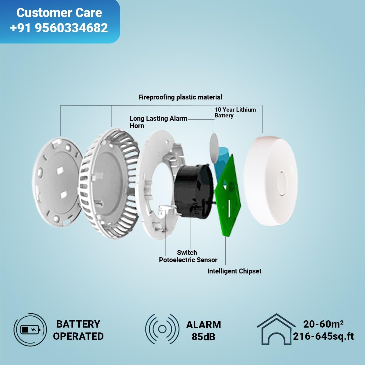 About this item 1. Easy Installation: Mounts effortlessly with included hardware, making it perfect for any room in your home. 2. Battery-Operated Convenience: Ensures continuous protection even during power outages; no wiring required. 3. Loud 85dB Alarm: Alerts you with a powerful, attention-grabbing sound to ensure you and your family are promptly warned. 4. Low Battery Warning & Easy Testing: Alerts for battery replacement and a test button for simple, periodic checks to ensure optimal performance. 5. Advanced Photoelectric Sensor: It detects smoldering fires with superior accuracy, reducing the risk of false alarms. 6. Convenient Maintenance: Easy to install and maintain, ensuring effortless protection for your property with our reliable fire smoke alert system.